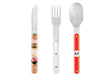 - Comprises a large spoon, a 4-pronged fork, and a knife with a micro-serrated blade