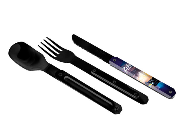 • Includes a large spoon, a 4-pronged fork, and a knife with a micro-serrated blade