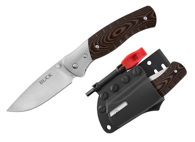 Setting itself apart, the Folding Selkirk Knife boasts an integrated 2.25-inch Ferrocerium striker complete with a whistle nestled within the grip, introducing an extra layer of functionality for unforeseen emergencies. To enhance your convenience, this knife comes accompanied by an injected moulded nylon sheath, allowing for flexible horizontal or vertical belt carry options that guarantee swift and effortless access whenever the need arises. Furthermore, the Folding Selkirk is underpinned by the esteemed Buck Forever Warranty, a testament to its exceptional quality and enduring performance.