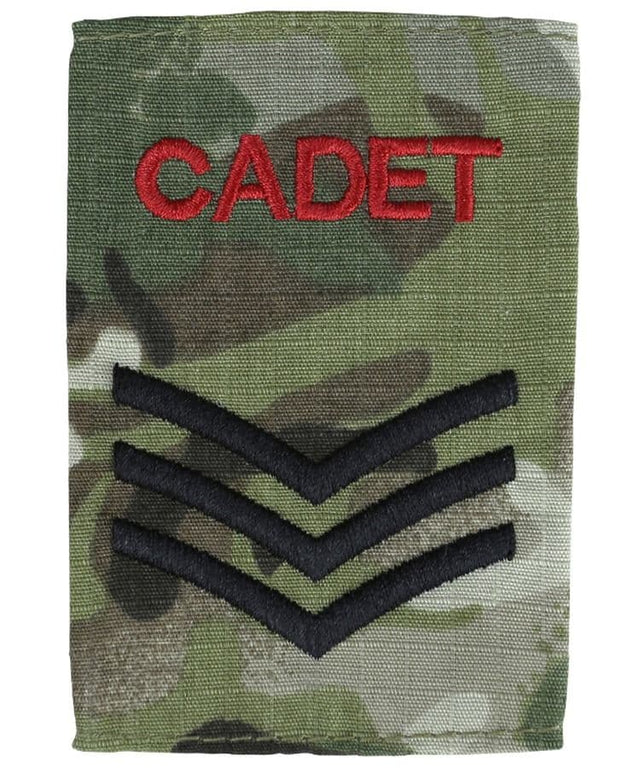 Made from durable BTP Ripstop material, each slide features intricate embroidery with 'Cadet' in bold red and the corresponding rank in classic black. Sold in pairs, these slides are ideal for cadets looking to maintain a polished appearance while showcasing their achievements.