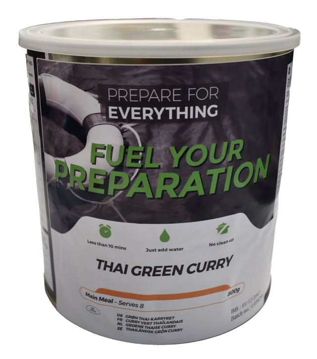 The Fuel Your Preparation Freeze Dried Food Ration Meal Tin - Thai Green Curry is sure to spice up your dinner times! A classic which the whole family is sure to love, this Thai green curry from Fuel Your Preparation is suitable for vegans. Freeze dried to lock in all of the delicious flavours and important nutrients, all you have to do is add boiling water and you will have a tasty, filling meal in minutes. At just 800g a tin, this tin contains a total of 8 servings and has a shelf life of 25 years! An ideal addition to your long term survival supplies.